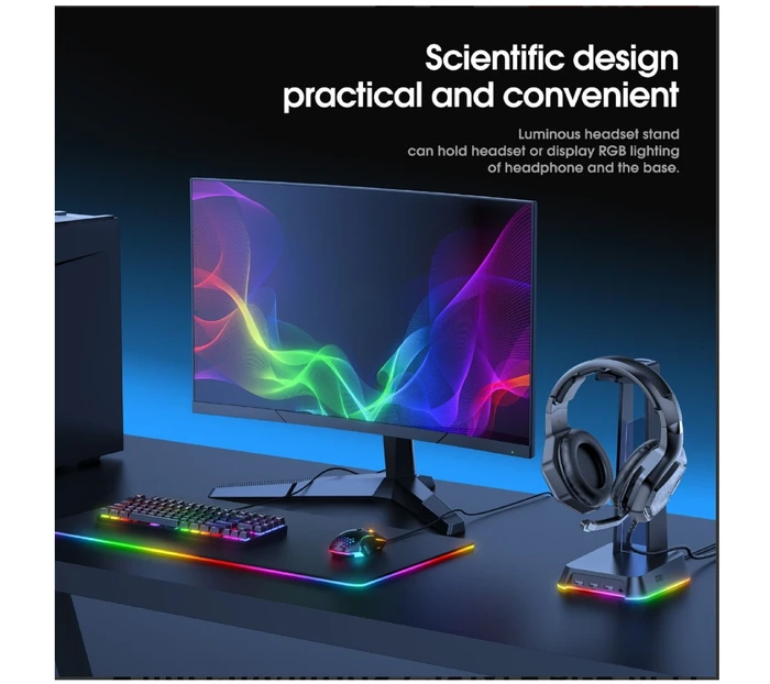 עיצוב חדשני המשלב מעמד מקצועי לאוזניות עם רכזת USB נוחה ותאורת RGB מרהיבה.