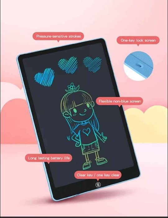 לוח דיגיטלי לציור וכתיבה לילדים, צור שוב ושוב ללא צורך בטעינה או חיבור, התמונה נשארת בלחיצת כפתור נעילה, וניתן למחוק בלחיצת כפתור.