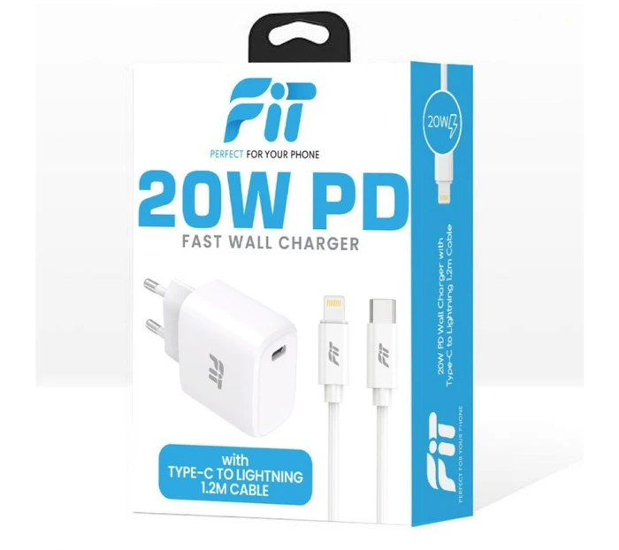 מטען קיר PD 20W עם כבל טייפ-סי ל-Lightning - חברת FiT באריזה מהודרת