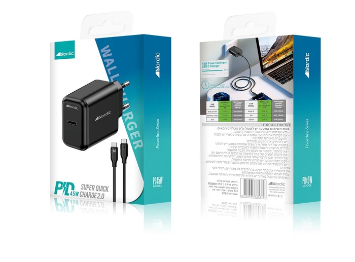 מטען קיר PD 45W עם כבל טייפ-סי לטייפ-סי