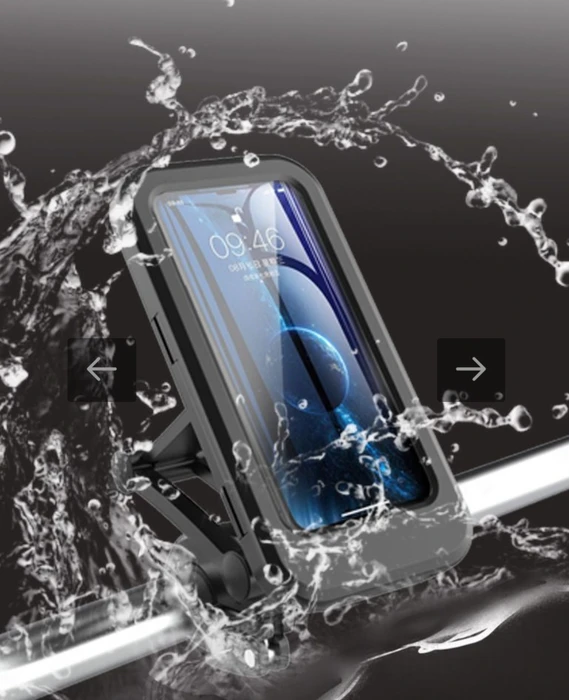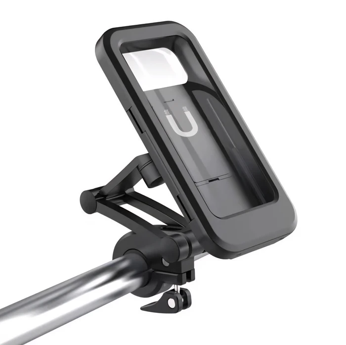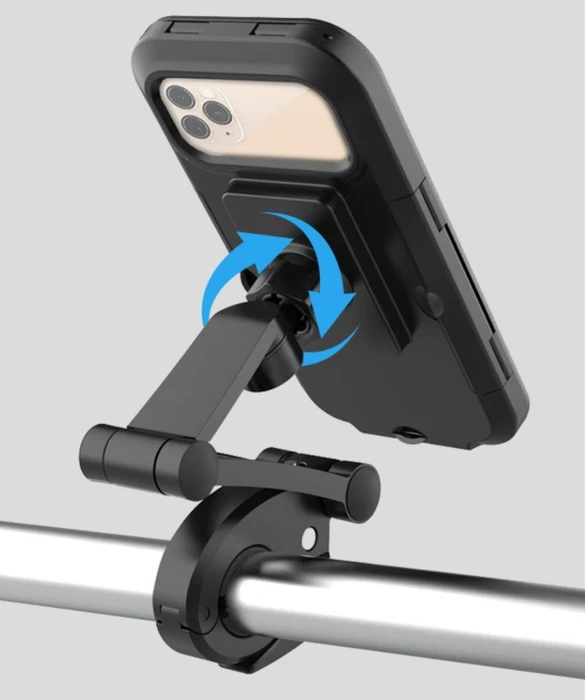 מעמד טלפון איכותי ואטום למים, הכולל נרתיק שקוף ומוגן, זרוע מתכווננת ופתחים לטעינה וחיבור אוזניות – שימוש בטוח ונוח בכל מזג אוויר.